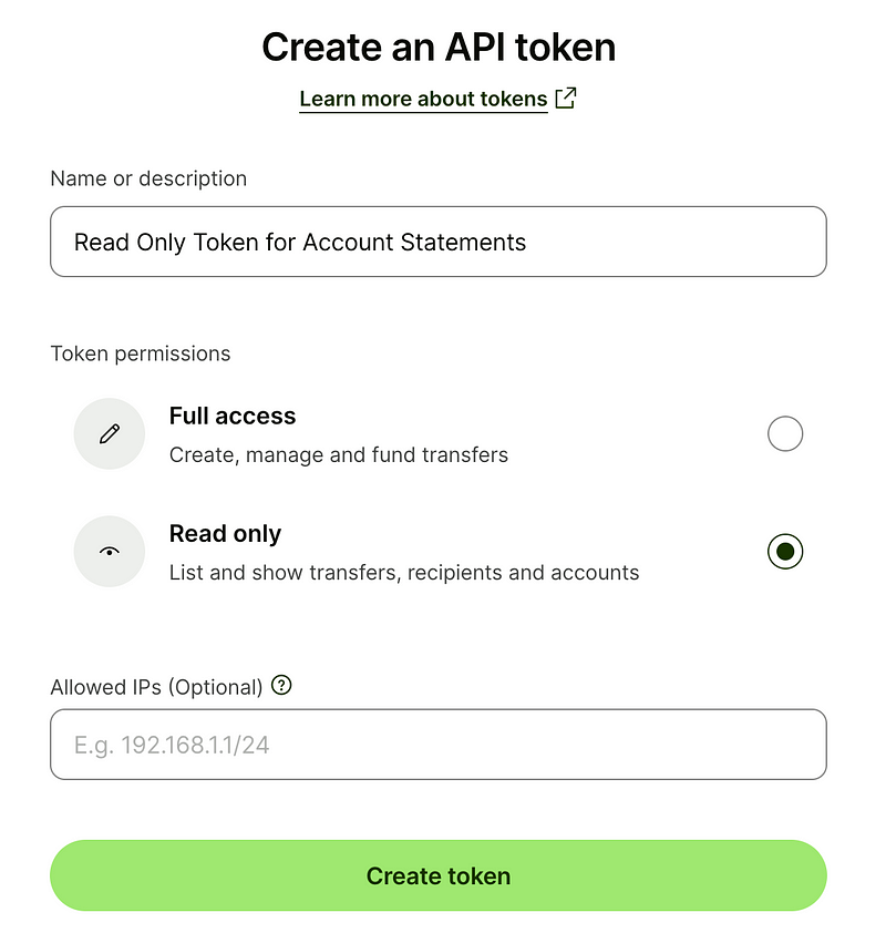 Setting this up requires a few steps. I recommend a trial run with a sandbox account at https://sandbox.transferwise.tech/. You’ll need to create an API token with read-only access and back it up securely. Additionally, generate a public key using the following commands in a cloned GitHub repository.